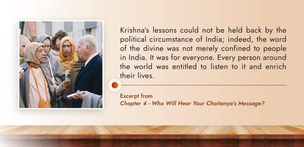When A.C. Bhaktivedanta Swami Srila Prabhupada entered the port of New York City on 17 September 1965, few Americans took notice--but he was not merely another immigrant. He was on a mission to introduce ancient teachings of Vedic India to mainstream America. Before his disappearance on 14 November 1977, his mission was successful. He had founded the International Society for Krishna Consciousness (ISKCON), colloquially known as the 'Hare Krishna Movement', and saw it grow into a worldwide confederation of more than 100 temples, ashrams and cultural centers.